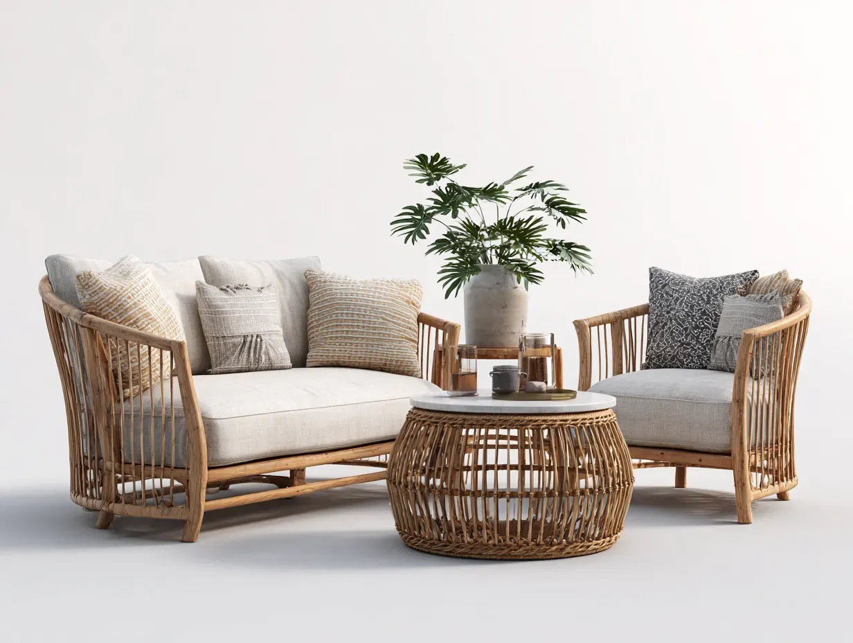 Canapé de jardin conçu pour aménager un espace extérieur lumineux et apaisant. L'association du rotin naturel et des assises claires crée une ambiance douce et accueillante, idéale pour une terrasse, un patio ou un jardin dédié à la détente.