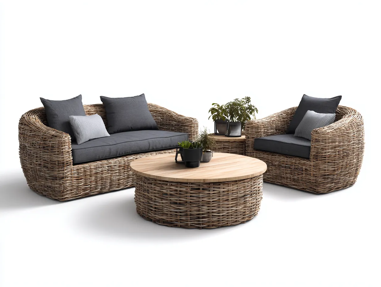 Assise profonde offrant un confort stable. Table basse centrale adaptée à l'usage quotidien pour poser boissons et objets. Table d'appoint complémentaire facilitant l'organisation de l'espace extérieur. L'ensemble favorise une circulation fluide autour du mobilier.