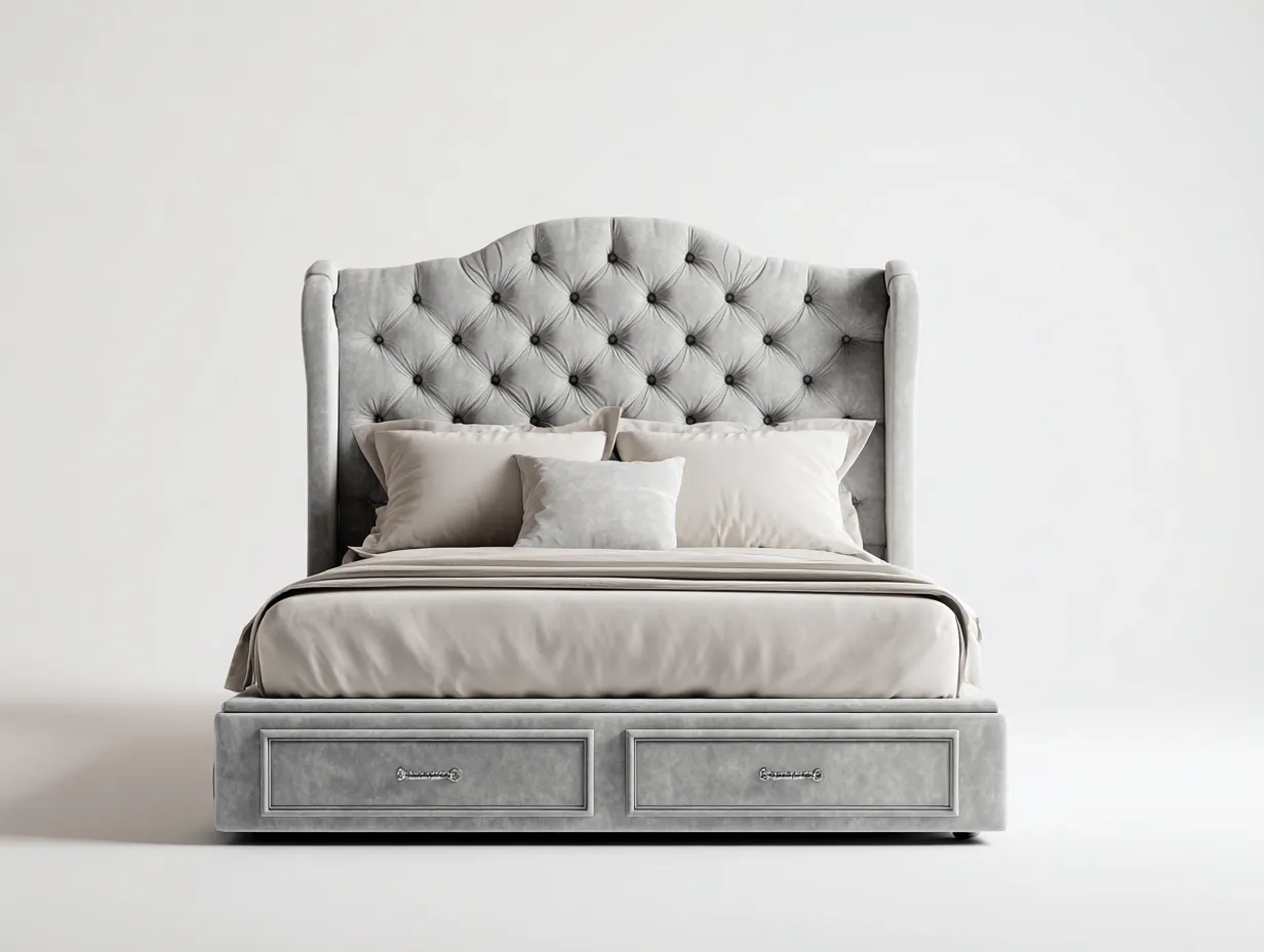 La structure est recouverte d'un tissu velours de couleur gris clair. La tête de lit capitonnée présente une finition régulière et une surface douce au toucher, contribuant à un aspect soigné et homogène.